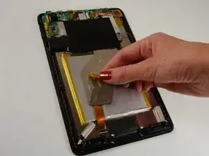Начните с того, что положите планшет лицом вниз и аккуратно снимите сетчатую проводку с задней части батареи.