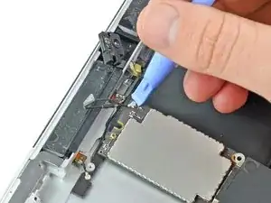Используйте пластиковый инструмент, чтобы помочь отдалить разъем для наушников от его углубления в верхней части iPad.