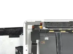Антенна прикреплена к нижней части iPad с помощью винтов и кабеля. Этот шаг отсоединяет антенну от передней панели, обеспечивая, чтобы при удалении панели антенна не была повреждена.