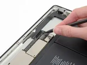 Антенна прикреплена к нижней части iPad винтами и кабелем. Этот шаг отделяет антенну от передней панели, гарантируя, что при снятии панели антенна не будет повреждена.