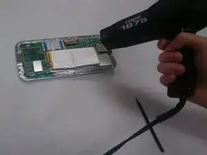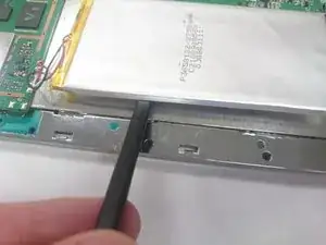 Осторожно вставьте лопатку или тонкую пластиковую карточку между батареей и корпусом устройства. Продвигайте лопатку или карточку вдоль батареи, чтобы освободить ее от клея.