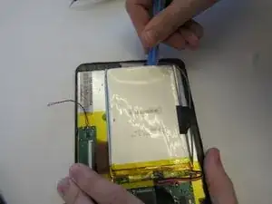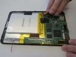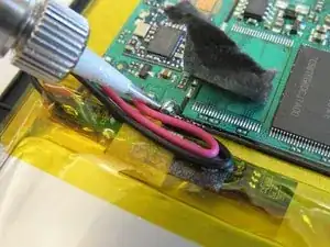 Удалите аккумуляторный блок, аккуратно поддев его с передней крышки. Затем удалите провода, соединяющие батарею с материнской платой, с помощью пинцета.