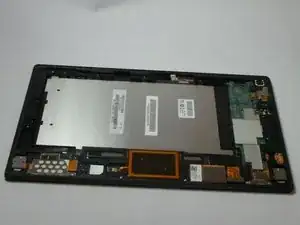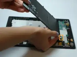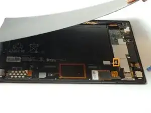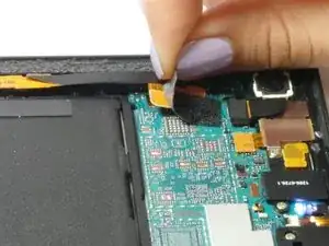 В верхнем правом углу устройства снимите кусок скотча, соединяющий фронтальную камеру с матерью платой.