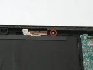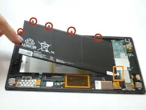 Удалите все винты, соединяющие батарею с планшетом. Места винтов показаны красными кругами.