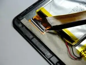 Снимите чёрную ленту, закрывающую разъём с нулевым усилием вставки (ZIF), который фиксирует конец жёлтого шлейфа, лежащего поверх батареи.