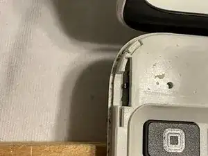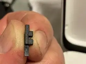 Если присмотреться, у чёрного ползунка есть выемка с одной стороны. Эта выемка должна быть обращена в сторону внутренней части корпуса. Я обнаружил, что его нужно вводить сначала со стороны шарнира, а затем укладывать в паз. Будьте очень осторожны, он легко выпадает. Я уложил его, подготовил серебристую накладку и аккуратно положил накладку поверх области, закрывающей ползунок.