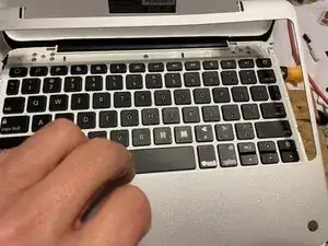 Когда нижняя часть ослаблена, аккуратно поднимайте ослабленные участки серебристой накладки. Она приклеена, поэтому работайте медленно и методично, чтобы ослабить её по всему периметру. Большая часть клея находится в области под клавишами. Сосредоточьтесь на этой области — тонкая верхняя часть ослабнет легко.
