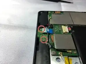 Удалите порт зарядки (micro-USB), открутив указанные винты с помощью отвертки Phillips #00.