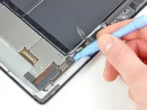 Передвигайте вскрывающий инструмент вдоль левого края iPad, отделяя клей по мере продвижения. Клей здесь тонкий из-за цифрового преобразователя, проходящего по всей левой стороне. Убедитесь, что инструмент не слишком глубоко вошёл под панель (не более 12 мм), чтобы не повредить цифровой преобразователь.