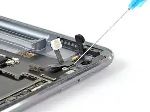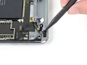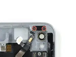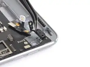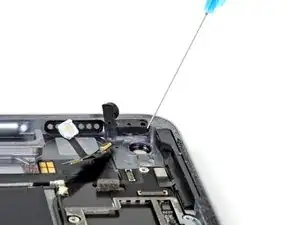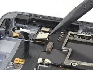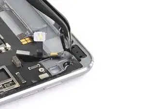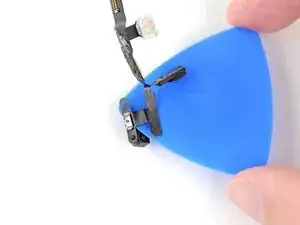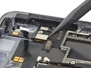 Если ZIF-разъём рядом с фронтальной камерой отключится при снятии верхнего динамика, используйте заострённый конец лопатки, чтобы отогнуть защёлку вверх. Затем вставьте лентовый кабель обратно и закройте защёлку.