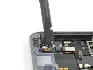 Используйте захват для вскрытия, чтобы прорезать клей, фиксирующий кабель кнопки питания к кронштейну кнопки питания.