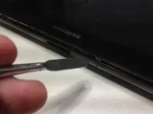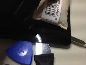 Далее возьмите металлическую лопатку и вставьте её в паз между тёмно-серым корпусом и чёрным стеклом дисплея.