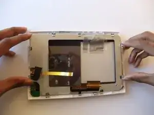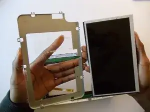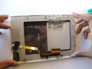 Медленно снимите металлическую рамку и экран с белого корпуса, аккуратно подтягивая концы металлической рамки вверх.