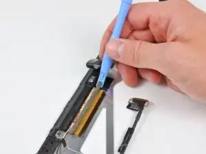 Используйте плоский конец лопатки, чтобы приподнять антенный разъём, ближайший к нижней части iPad, и отсоединить его от гнезда на плате коммуникаций.