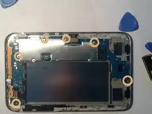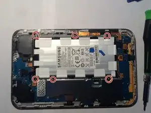 Удалите 6 винтов, удерживающих батарею]