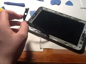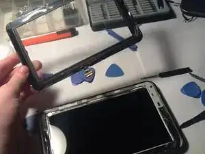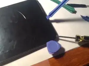 Переверните её и нагрейте стекло с помощью теплового пистолета, вставив пластиковый инструмент для вскрытия.
