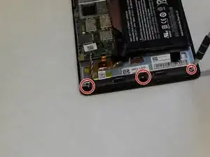 С помощью пластикового инструмента начните разъединять заднюю крышку планшета, работая по краям.