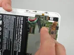 Используя лопатку, подденьте разъем аккумулятора, расположенный над аккумулятором с левой стороны, и аккуратно поднимите его.