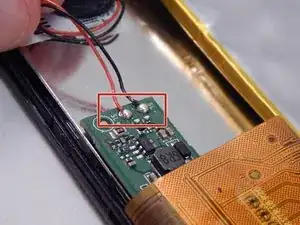 Внутренний динамик приклеен к внутренней стороне задней панели. К динамику подходят два провода, соединённые с платой, которые могут быть повреждены при неосторожных действиях. После открытия динамик можно снять с задней панели, удалив ленту с помощью пинцета или пальцев.