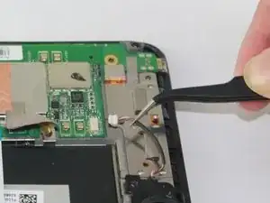 Аккуратно отключите провод динамика от устройства, схватив провод возле белого разъёма пинцетом и слегка потянув.