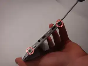 Используйте крестовую отвертку #00, чтобы удалить два винта длиной 4 мм, расположенные на верхнем крае планшета у кнопки питания.