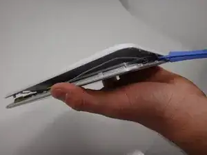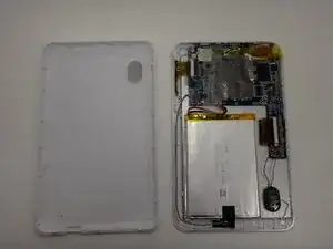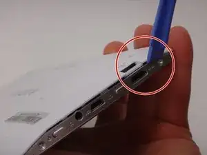 Используйте пластиковый инструмент для вскрытия, чтобы приподнять белую заднюю крышку от серебряной рамки. Начните рядом с разъемом micro SD.