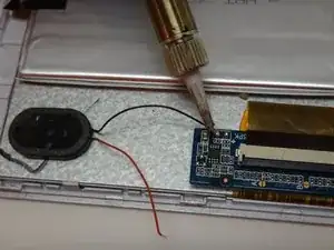 Используйте паяльник, чтобы отпаять соединения между черными и красными проводами динамика и материнской платой.