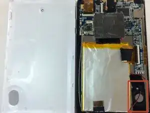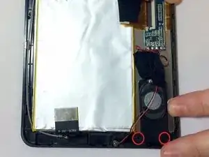 Динамик закреплён двумя винтами размером 3,75 мм и 3,81 мм в основании пластиковой планки, удерживающей динамик. Эти два винта необходимо выкрутить, чтобы заменить динамик, используя отвертку «пенталоб».