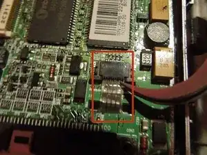 Отсоедините две пары проводов, находящихся в верхнем правом углу материнской платы, от их фиксаторов с помощью пинцета из инструментария.