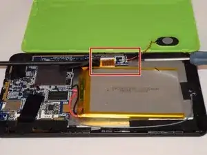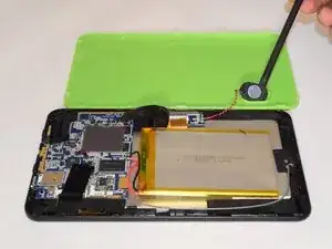 После съёма пластиковой задней панели откроются батарея и материнская плата. Затем снимите ленту с провода динамика.