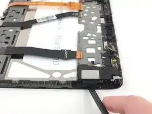 Сдвиньте медиатор вдоль кромки задней крышки, пока не освободите пластиковые защёлки, крепящие заднюю крышку к дисплею.