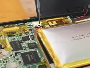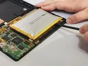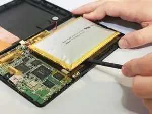 Затем, используя осторожное движение для поддевания и скольжения, отделите батарею от корпуса. Две продольные полоски клея удерживают ее на месте.
