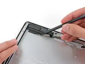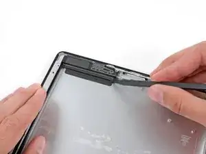 Некоторая часть клея по периметру iPad могла снова приклеиться. В этом случае подденьте медиатор под край iPad в месте, где стекло всё ещё приклеено, и «перережьте» клей.