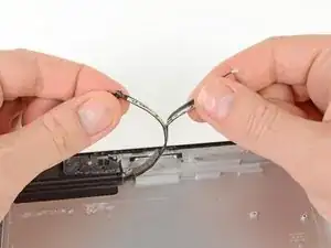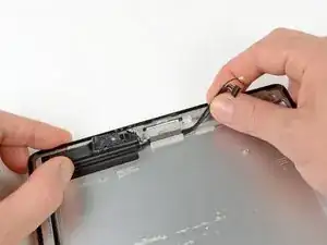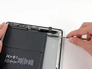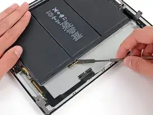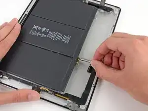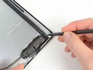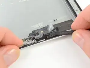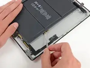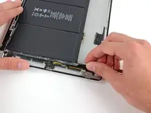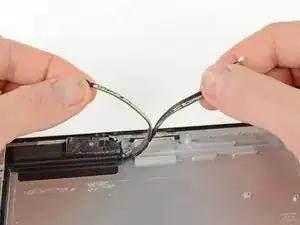 Антенна прикреплена к нижней части iPad винтами и кабелем. Этот шаг отсоединяет антенну от передней панели, гарантируя, что при снятии панели антенна не будет повреждена.