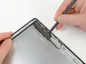 Используя медиатор, который всё ещё находится под нижней кромкой iPad, отрезвите клей в нижнем левом углу.