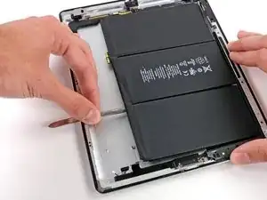 Вставьте плоский конец металлической лопатки под батарею рядом с нижней частью iPad.