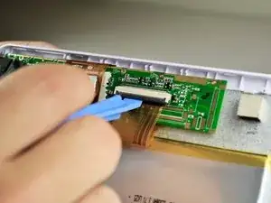 Поместите пластиковый инструмент под основание чёрного зажима ленточного кабеля и поднимите вверх, как рычаг, чтобы освободить крепление. Это должно освободить зажим, удерживающий шлейф в разъёме.