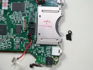 Осторожно переверните материнскую плату, поворачивая её от узла дисплея вдоль длинного края с микрофоном и динамиком, как показано.