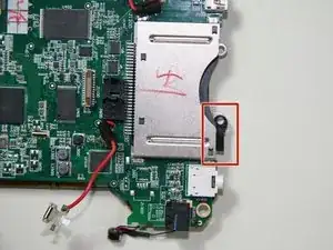 Сдвиньте материнскую плату в направлении слота для картриджа до тех пор, пока плата не выйдет из-под металлических защёлок на узле дисплея.