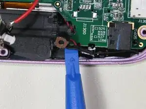 Используйте маленький пластиковый инструмент для раскрытия, чтобы осторожно поддеть под чёрный провод бокового микрофона и вынуть микрофон из его гнезда.