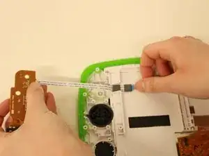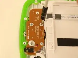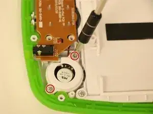 Снимите коричневую плату динамика, расположенную с левой стороны LeapPad, открутив следующие винты, удерживающие её на месте: