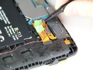С помощью медиатора подденьте разъём на плате, ведущий к задней камере, чтобы отключить его.