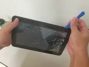 Вставьте пластиковый инструмент для открытия в зазор между экраном и задней крышкой планшета. Перемещайте инструмент вдоль зазора, пока задняя крышка не освободится.