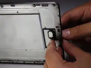 С помощью пластикового инструмента для открывания надавите на динамик с передней стороны панели, чтобы ослабить динамик. Потребуется приложить усилие. Как только он освободится, используйте указательный палец, чтобы выталкивать его.