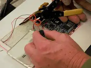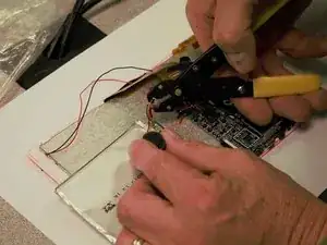 После открытия устройства возьмите провода динамика и обрежьте как красный, так и черный провода посредине с помощью инструмента для обрезки/ stripping. Затем обнажите концы красного и черного проводов тем же инструментом.