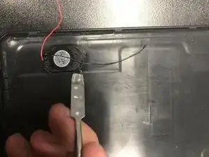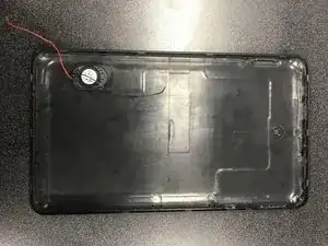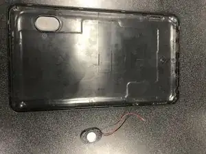 Найдите динамик в нижнем левом углу с красным и черным проводами, выходящими из динамика, и найдите тонкий клин или острое нож.