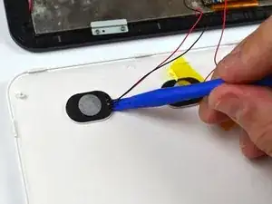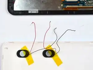 Динамики прикреплены к внутренней стороне задней крышки и соединены проводами с материнской платой планшета. Аккуратно отложите заднюю крышку, чтобы не оборвать провода.
