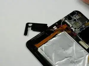 Снимите пластиковый L-образный корпус динамика пальцами и извлеките его из планшета.