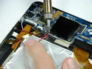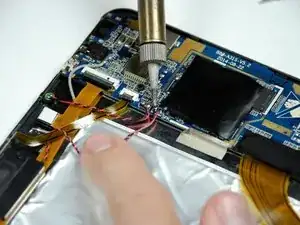 Используйте паяльник, чтобы расплавить припой на красном и чёрном проводах, которые соединяют динамик с платой.