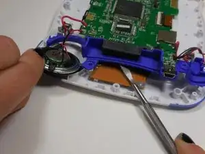 Удерживая пластиковую деталь поднятой, аккуратно зажимайте край динамика и извлеките его.